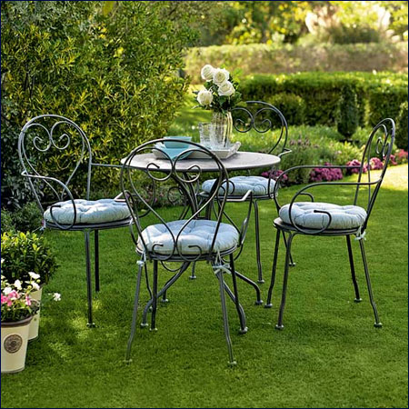 Đồ ngoại thất sân vườn bằng kim loại có nhiều mẫu mã sáng tạo, ít phải bảo quản mà lại bền lâu. Trước đây, hầu hết các sản phẩm đều làm bằng gang, chất liệu khá nặng và phải sơn lại hàng năm để phòng gỉ sét. Ngày nay, người ta có thể sử dụng nhôm, chất liệu nhẹ hơn và không gỉ sét.