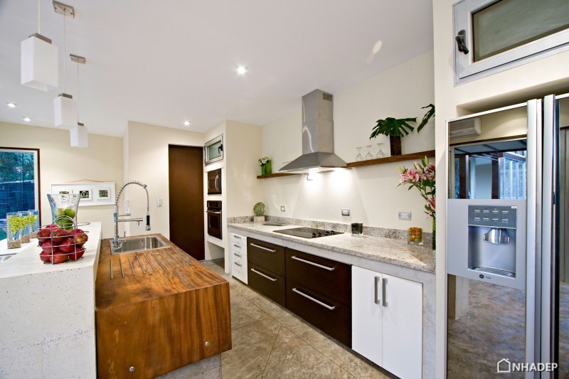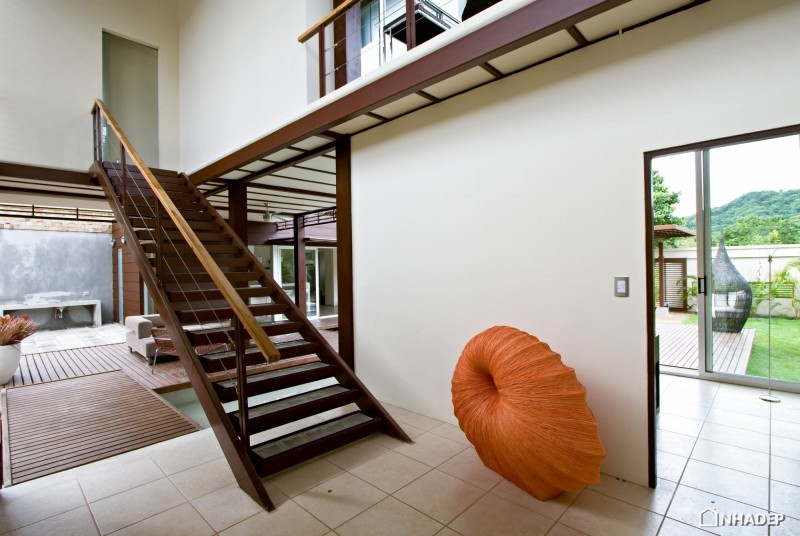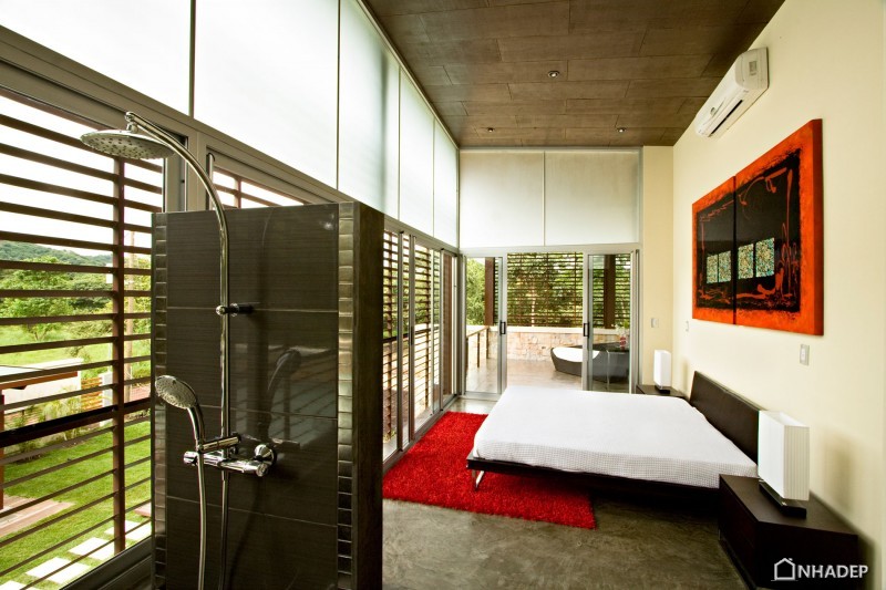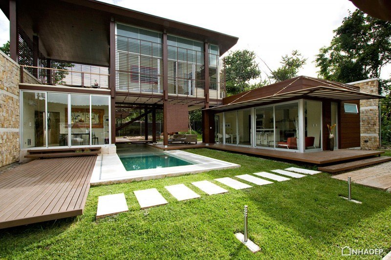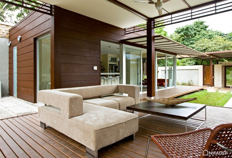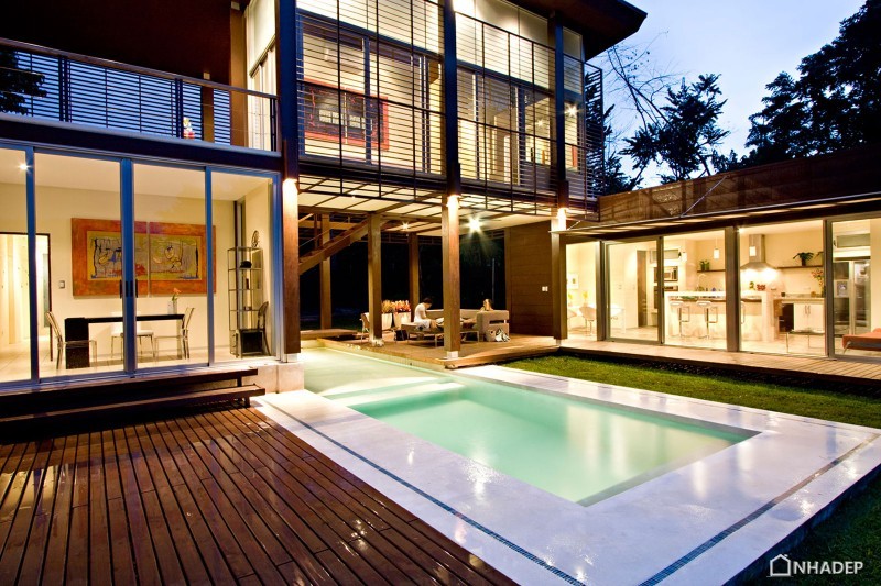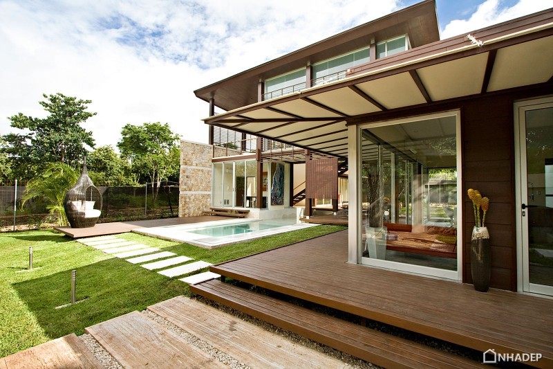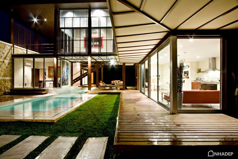 Nằm ở trung tâm của căn nhà là không gian phòng khách mở được trang bị bởi đồ nội thất đơn giản, và cũng từ đây, chúng ta có thể dễ dàng tiếp cận với hồ bơi nhỏ ngoài trời của gia đình. Ở trong một không gian như thế này thì hẳn những lo toan thường ngày của cuộc sống sẽ bị quên lãng, nhường chỗ cho sự bình yên khi gia chủ thả hồn vào thiên nhiên tươi đẹp của vùng khí hậu nhiệt đới đầy nắng và những làn gió thoảng.