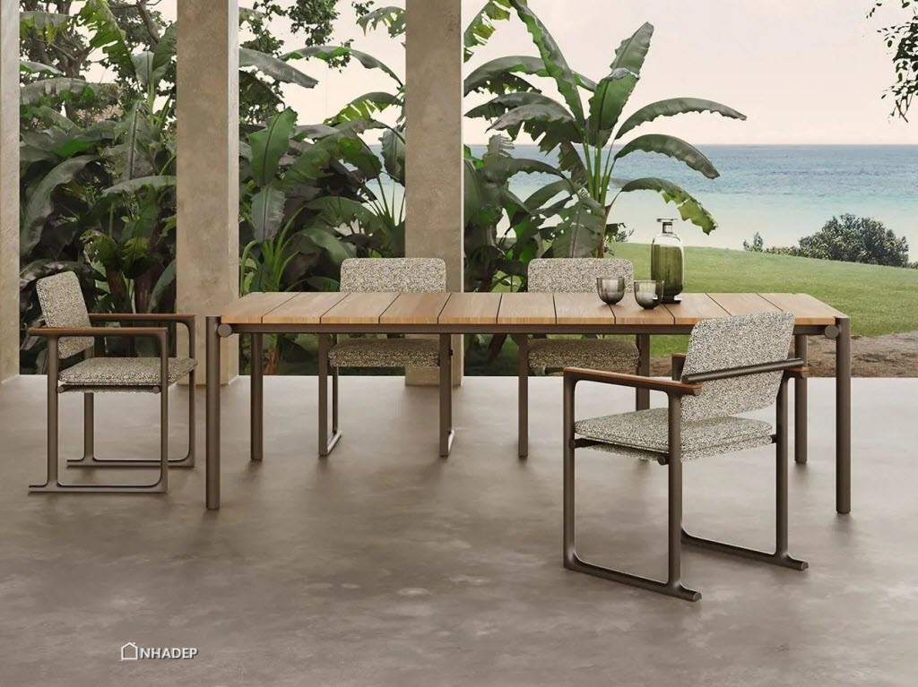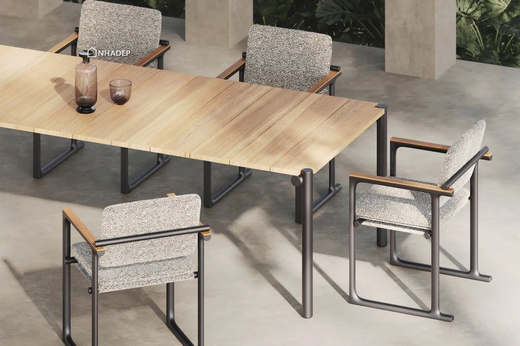 Gỗ teak là loại gỗ thường được các nhà sản xuất lựa chọn cho các sản phẩm đồ ngoại thất bởi độ bền và khả năng thích ứng với sự thay đổi của thời tiết. Phần cấu trúc nhôm được hoàn thiện tỉ mỉ đến từng mối hàn, làm cho sản phẩm có được sự hài hòa thanh lịch và hiện đại mà không gây chú ý.